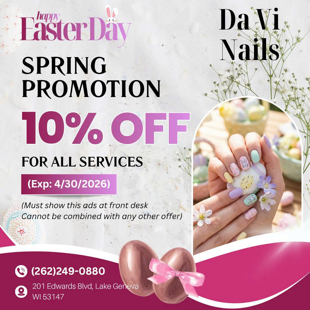 Located conveniently in Lake Geneva, WI 53147, our nail salon pleased to provide the clean and welcome atmosphere, which will make you freely enjoy the relax moments and escape from all of life’s pressure to make the most of wonderful time.
